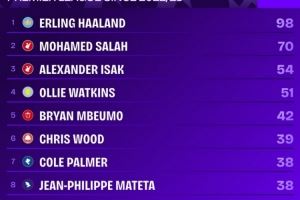 22-23赛季以来英超射手榜:哈兰德98球断层居首,萨拉赫70球次席