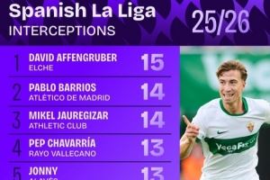 体育资讯10月7日讯 日前,Squawka统计了本赛季西甲拦截次数排行,巴里奥斯14次并列第2,琼阿梅尼12次并列第6。